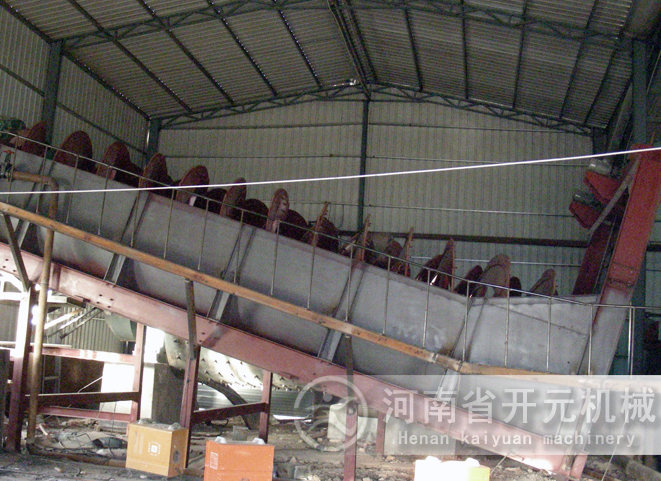 螺旋分級機是借助于固體粒大小不同,比重不同,因而在液體中的沉降速度不同的原理,細礦粒浮游在水中成溢流出,粗礦粒沉于槽底。由螺旋推向上部排出,來進行機械分級的一種分級設備,能把磨機內磨出的料粉級于過濾,然后把粗料利用螺旋片旋片旋入磨機進料口,把過濾出的細料從溢流管子排出。該機底座采用槽鋼,機體采用鋼板焊接而成。螺旋軸的入水頭、軸頭、采用生鐵套,耐磨耐用,提升裝置分電動和手動兩種.