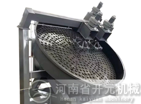 圓盤造粒機是有機肥行業的常用設備之一,一般適用于中、低濃度,小規模的生產,成球盤調整到40°-55°之間。由電機減速機帶動齒輪從而加入混配好的原料肥。由于粉肥和圓盤旋轉而上升,又在重力的作用下向下滾動,在以上幾種力的作用下,盤內物料逐漸形成基核直至達到成品顆粒,由圓盤邊溢出。本機具有成球率高、顆粒圓潤、強度大、防腐、操作直觀、維修方便等特點。