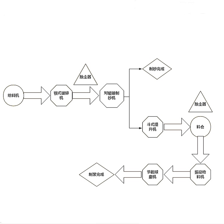 針對(duì)李總的煤矸石原料大小(200mm),以及時(shí)產(chǎn)量的要求(100T),我們?yōu)槠湓O(shè)計(jì)了煤矸石制砂方案,需要使用到的設(shè)備有給料機(jī)、顎式破碎機(jī)、對(duì)輥制砂機(jī)等。另外李總還提到在煤矸石制砂完成后想進(jìn)一步將其制作成漿,需要使用到的后續(xù)設(shè)備有斗式提升機(jī)、料倉、振動(dòng)給料機(jī)、節(jié)能球磨機(jī)等。大家都知道石料在制砂過程中難免會(huì)產(chǎn)生大量灰塵,而國家對(duì)生產(chǎn)時(shí)的環(huán)保有一定的標(biāo)準(zhǔn),因此我們?cè)谡麄€(gè)生產(chǎn)線當(dāng)中配備了兩臺(tái)除塵器,以實(shí)現(xiàn)綠色環(huán)保生產(chǎn)。具體工藝流程如下: